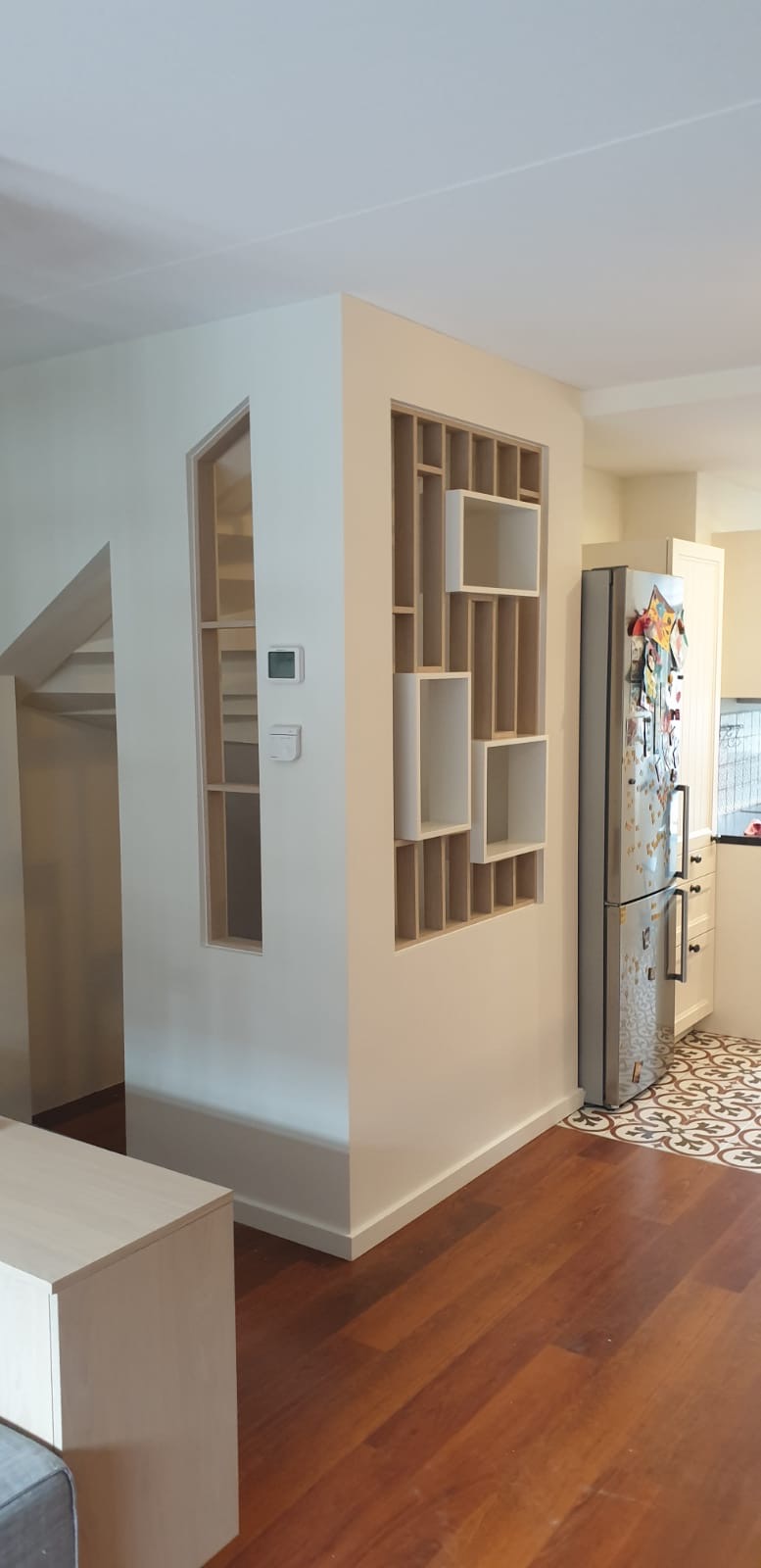 Nieuw interieur Polderweg Amsterdam 2024. Op de Polderweg in Amsterdam ondergaat het interieur een opmerkelijke nieuwe transformatie. Door het streven naar vernieuwing en gezelligheid heeft dit geleid tot een mooi doordacht ontwerp. Waarin vooral meer kleur en eenheid centraal staan. Bij dit project moest er een  speciale hobbyruimte in de woonkamer komen. Deze ruimte hebben we gecreëerd onder de trap naar de bovenverdieping. Deze ruimte is niet alleen praktisch. Om te kunnen werken als gewenst. Maar vooral als hobby ruimte dat je de spullen kunt laten liggen zonder dat het rommelig oogt. Ook draagt deze bij aan een warme en knusse sfeer. Omdat je in de bakken van de afscheiding leuke decoratie kan zetten. Een mooi beeldje of plantje maakt het erg gezellig en persoonlijk. En in de slaapkamer hebben we ook een extra werkruimte gecreëerd. Hier voor hebben we gebruik gemaakt van een geperforeerde afscheidingswand met akoestiek materiaal aan de achterkant, deze zorgt voor een goede akoestiek en afzondering om goed te kunnen werken. En toch lichtdoorlatend dat je niet het gevoel hebt dat je in een donker hokje zit. Voor de dochter des huizes. Wordt de kinderkamer op maat gemaakt met levendige kleuren en speelse accenten die een vrolijke en inspirerende omgeving creëren. Een super frisse leuk kamer geworden. Het zomerse probleem van overmatig zonlicht wordt aangepakt met een doordachte oplossingen zoals lichte gordijnen en de pergola door te laten lopen. Met daaronder een schuif doek om zo de zon als het warm is niet naar binnen kan schijnen. Waardoor temperatuur wordt beheerst en een aangename lichtinval behouden blijft. Als het doek niet gebruikt wordt. Er word unieke wens van de heer des huizes vervuld door het combineren van een spel- en eettafel. Dit multifunctionele meubelstuk zal dienen als een centrale plek voor gezamenlijke maaltijden en het spelen van favoriete spellen. Met de meubelmaker “Hou van Hout” aan boord, staan de ontwerpen op het punt werkelijkheid te worden. De uitvoering van het project is in januari en februari 2024.  Dat belooft een prachtig resultaat op te leveren. Volg deze website voor regelmatige updates en een exclusief kijkje in het eindresultaat van dit boeiende en creatieve avontuur. De onthulling in het nieuwe jaar zal ongetwijfeld een perfecte realisatie zijn van de al gemaakte tekeningen.