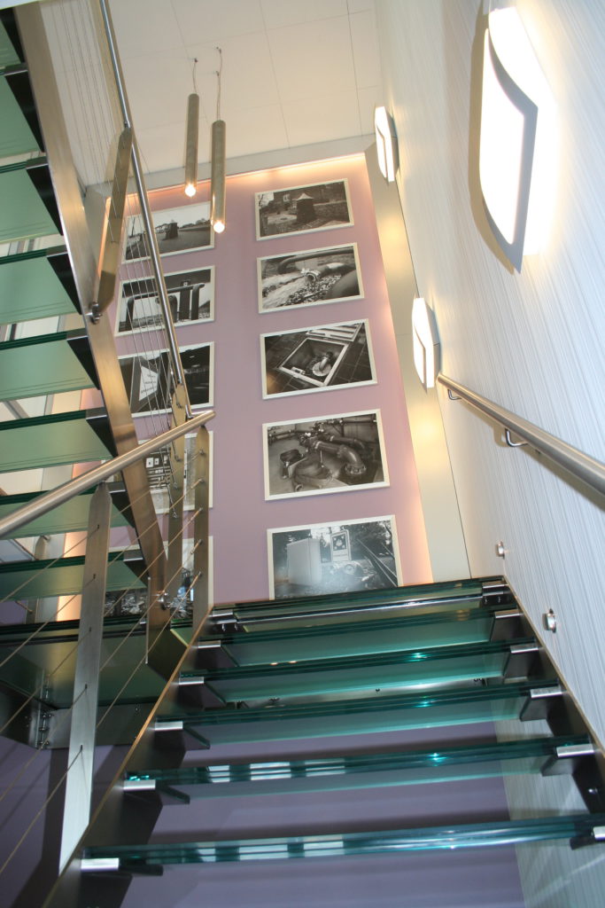 Verder wilde de opdrachtgever een glazen trap om voor de bezoekers een wat nettere indruk te maken. Dit is een RVS trap met glas geworden. Als decoratie zijn er RVS lijsten gemaakt met werk gerelateerde foto’s, met daarachter sfeervol licht. En het kantoor gedeelte moest vooral een licht en warme uitstraling hebben met een schitterend zicht op het Veluwemeer.
